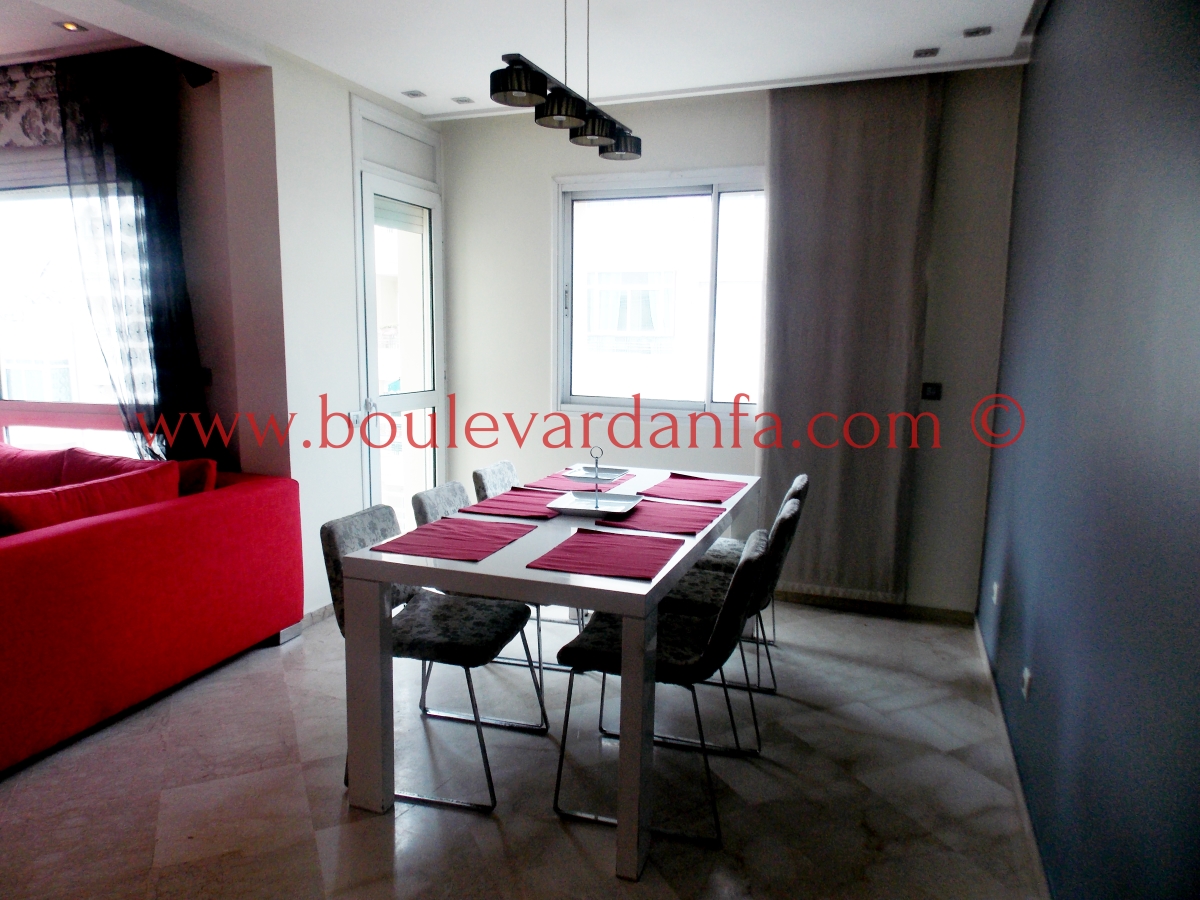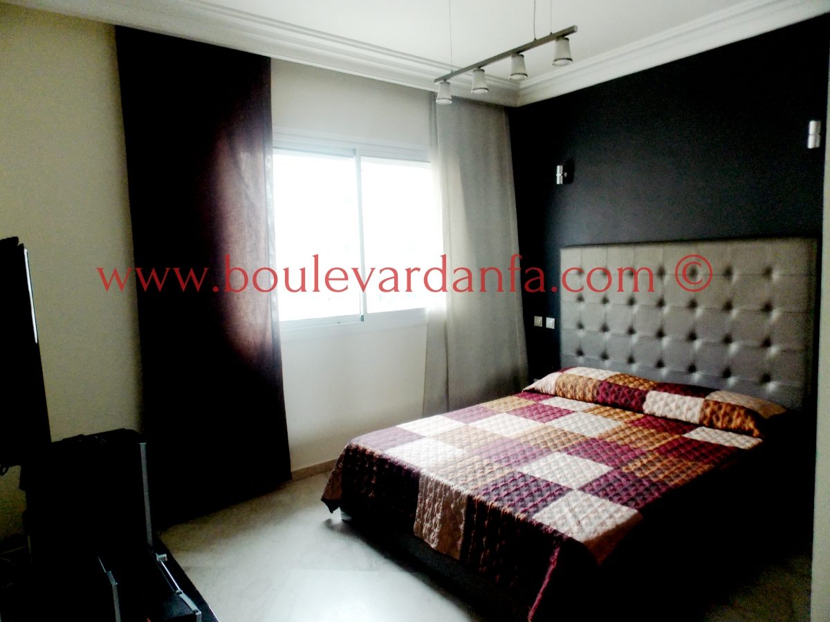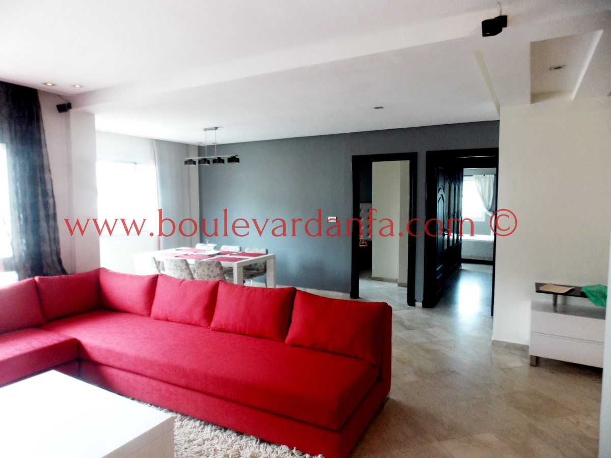 Très joli appartement de 113m² sur boulevard Bir Anzarane, proches de toutes les commodités. Il est composé d’un double salon européen, de deux chambres dont une suite parentale, deux salles de bain, une cuisine bien équipée et un balcon.