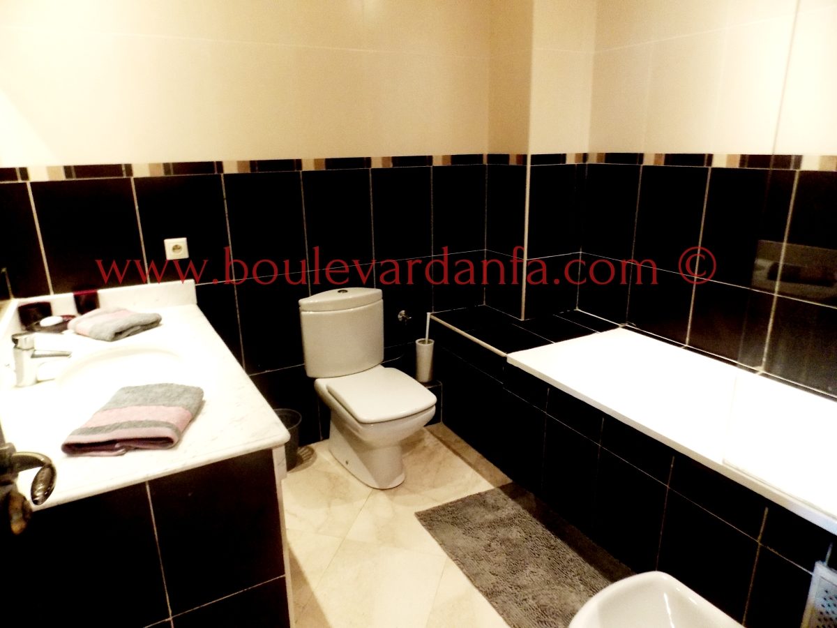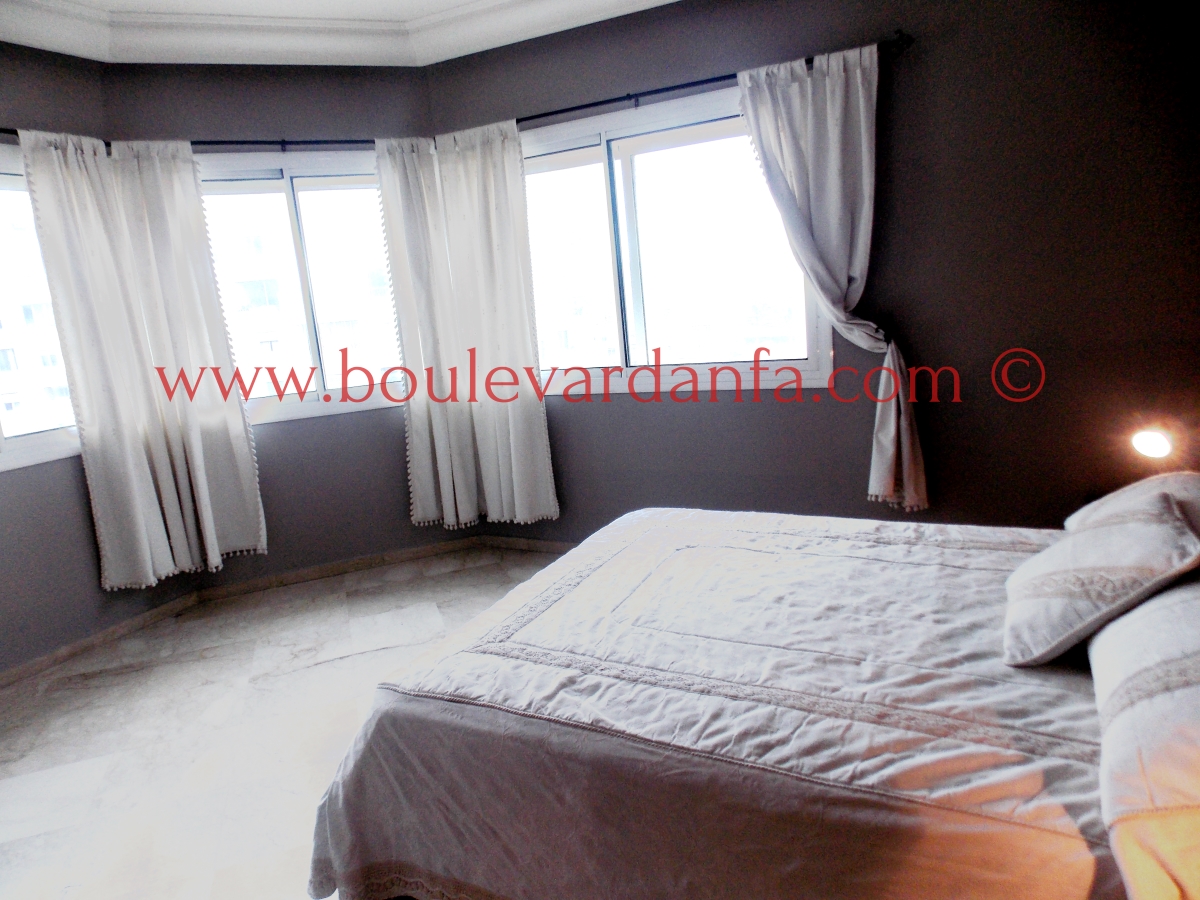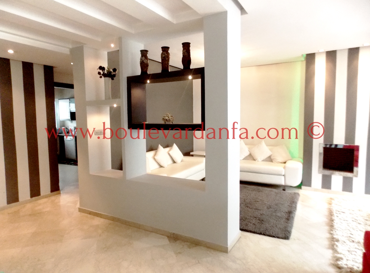 Très joli appartement de 113m² sur boulevard Bir Anzarane, proches de toutes les commodités. Il est composé d’un double salon européen, de deux chambres dont une suite parentale, deux salles de bain, une cuisine bien équipée et un balcon.