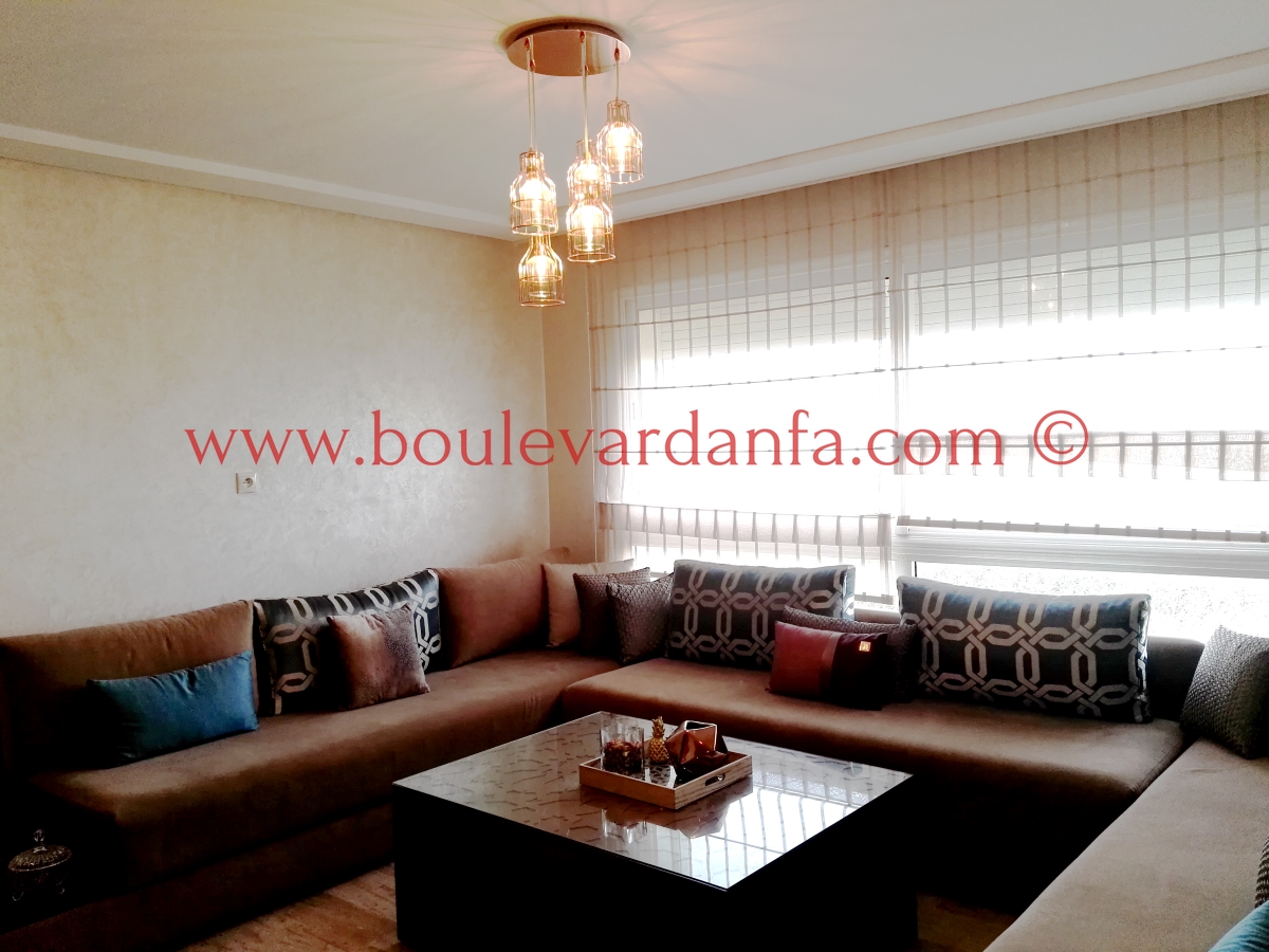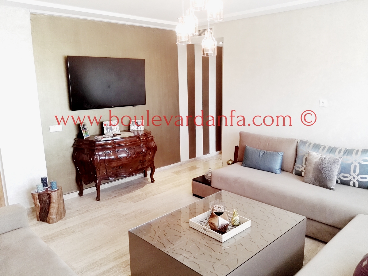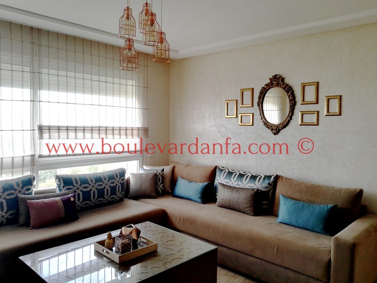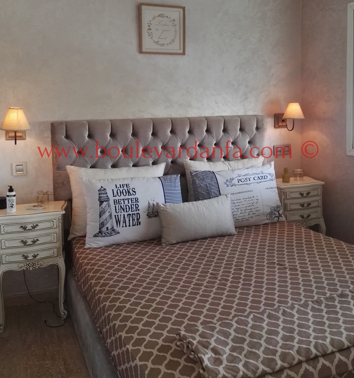 Très joli appartement meublé à louer à Puerto Marina à Dar Bouazza, dans une residence fermée, sécurisée et avec piscine. Il est composé de deux chambres, un salon avec vue sur mer, une salle de bain et une cuisine équipée.
