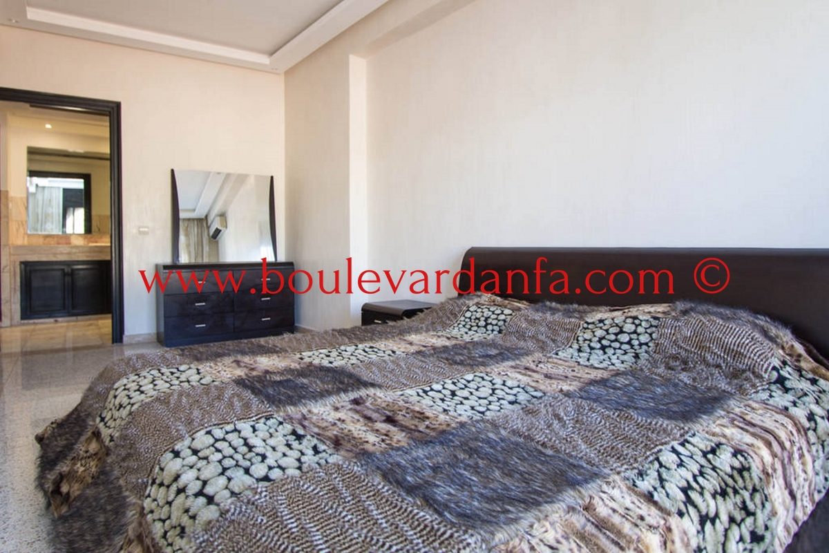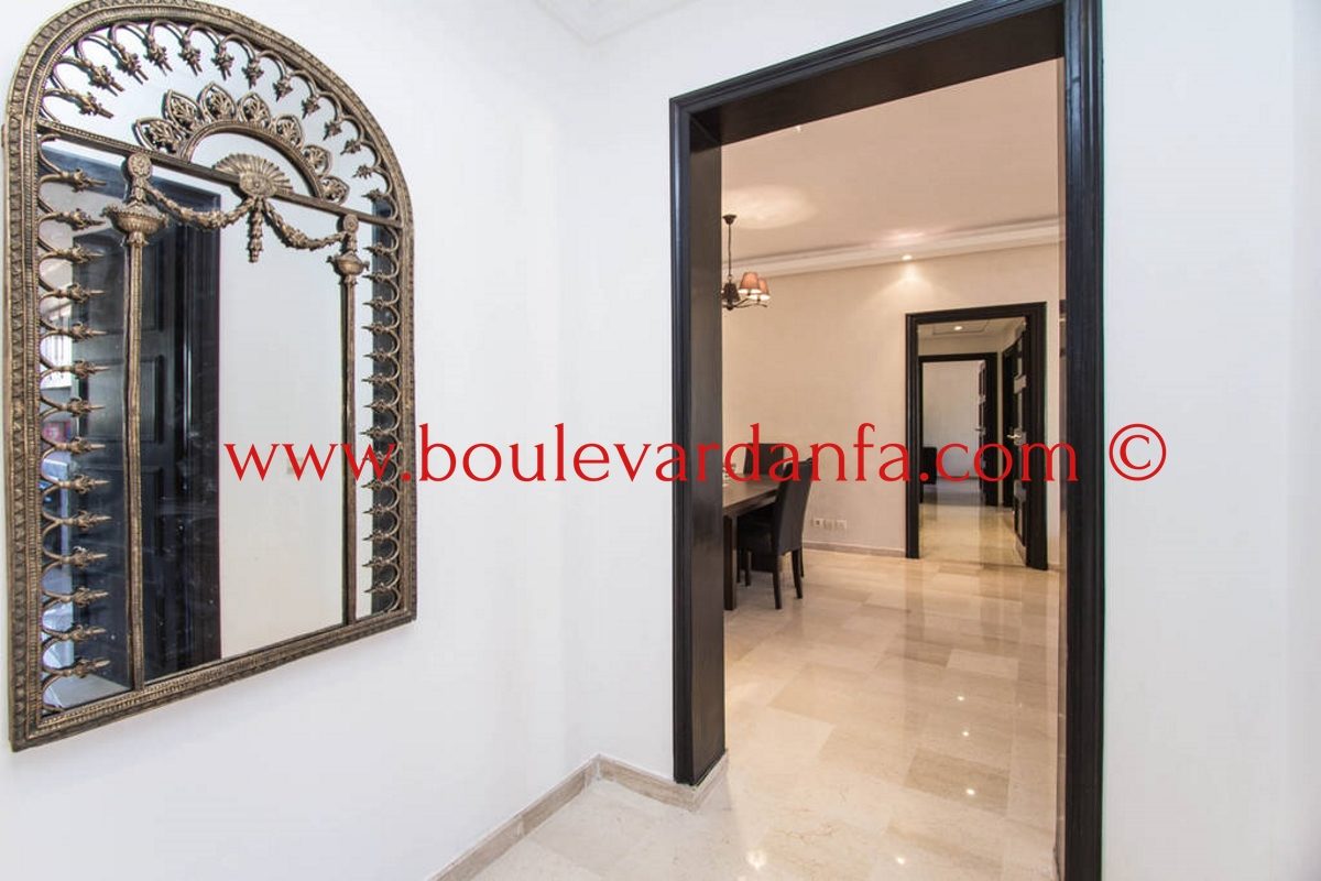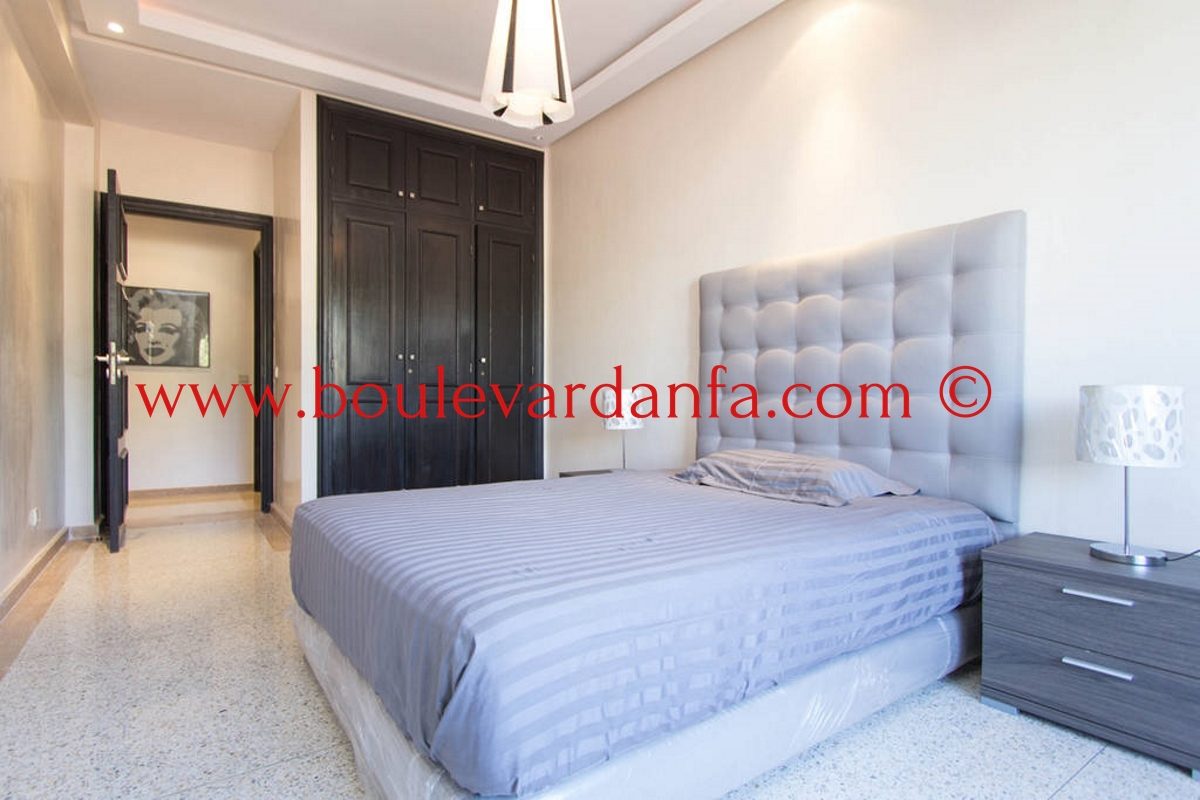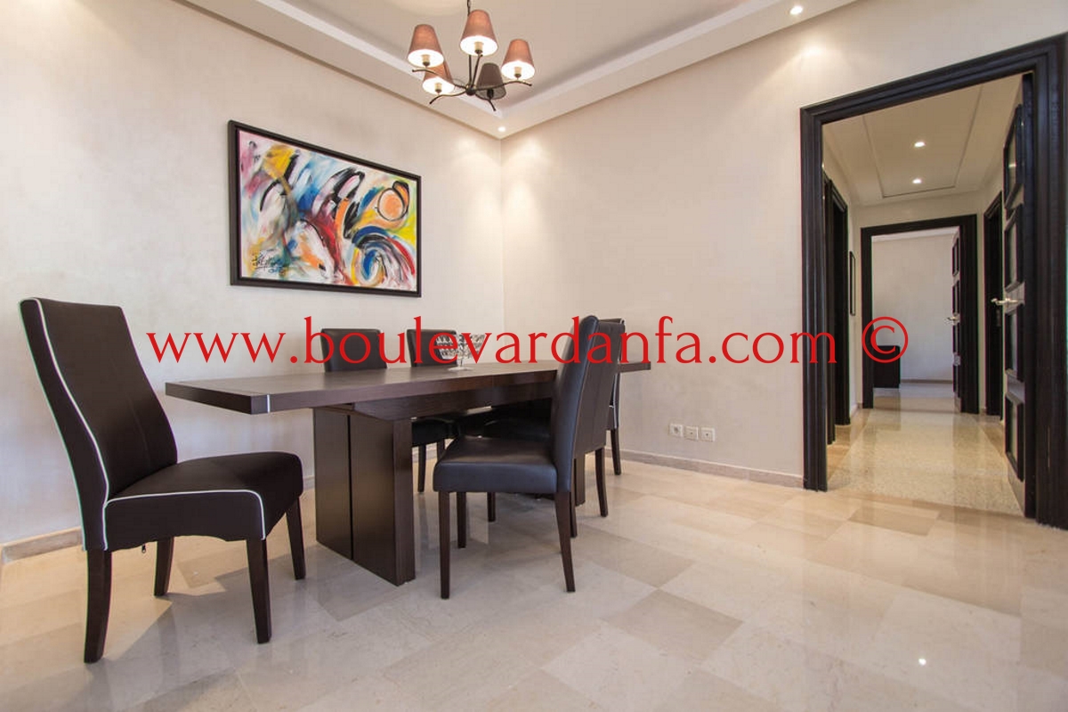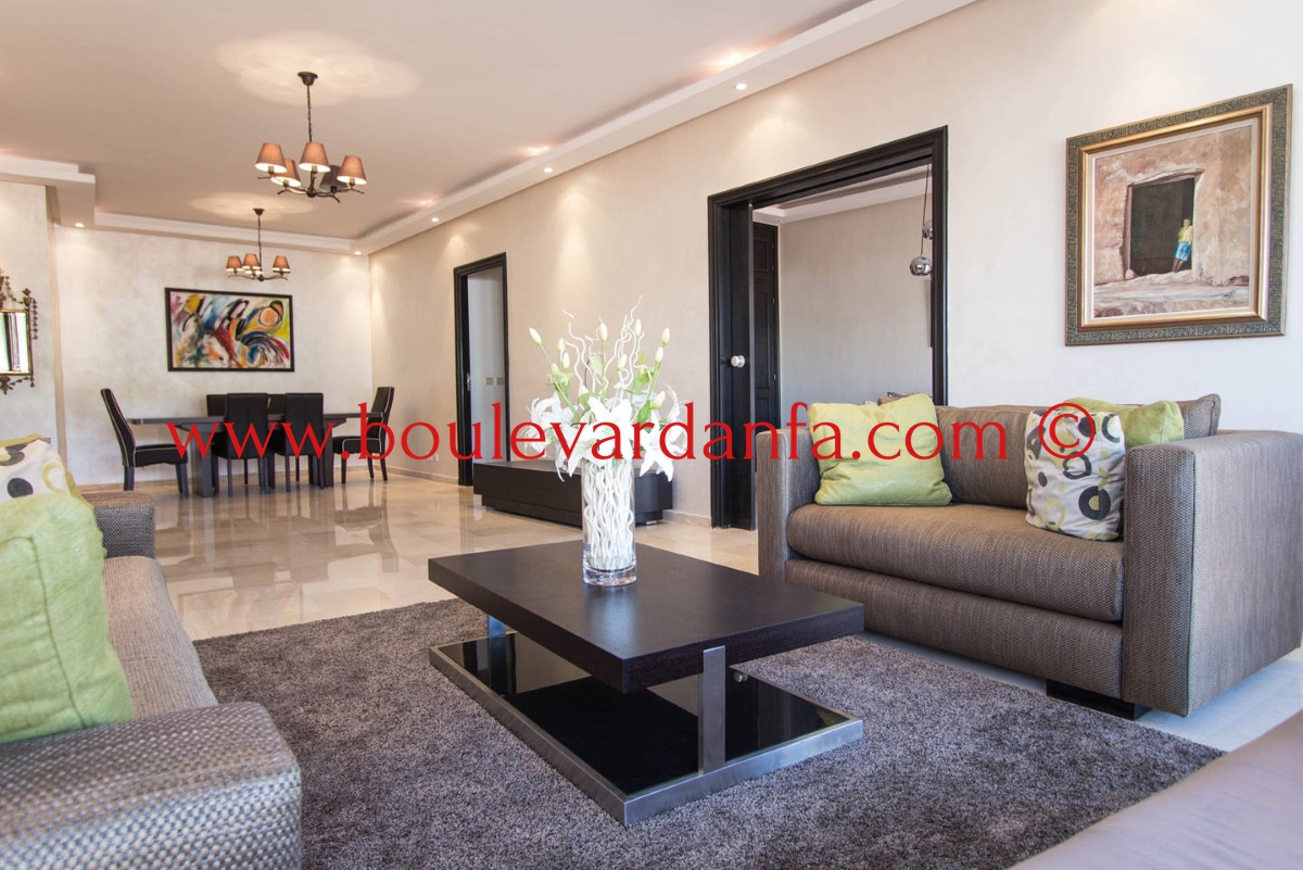 Charmant appartement meublé de 167m² à louer à ain diab dans une résidence calme et sécurisée 24h/24. Il est composé de trois chambres, un double salon avec un espace salle à manger, trois salles de bain, un petit dressing, une cuisine équipée et 2 balcons.
