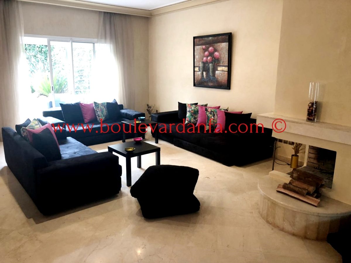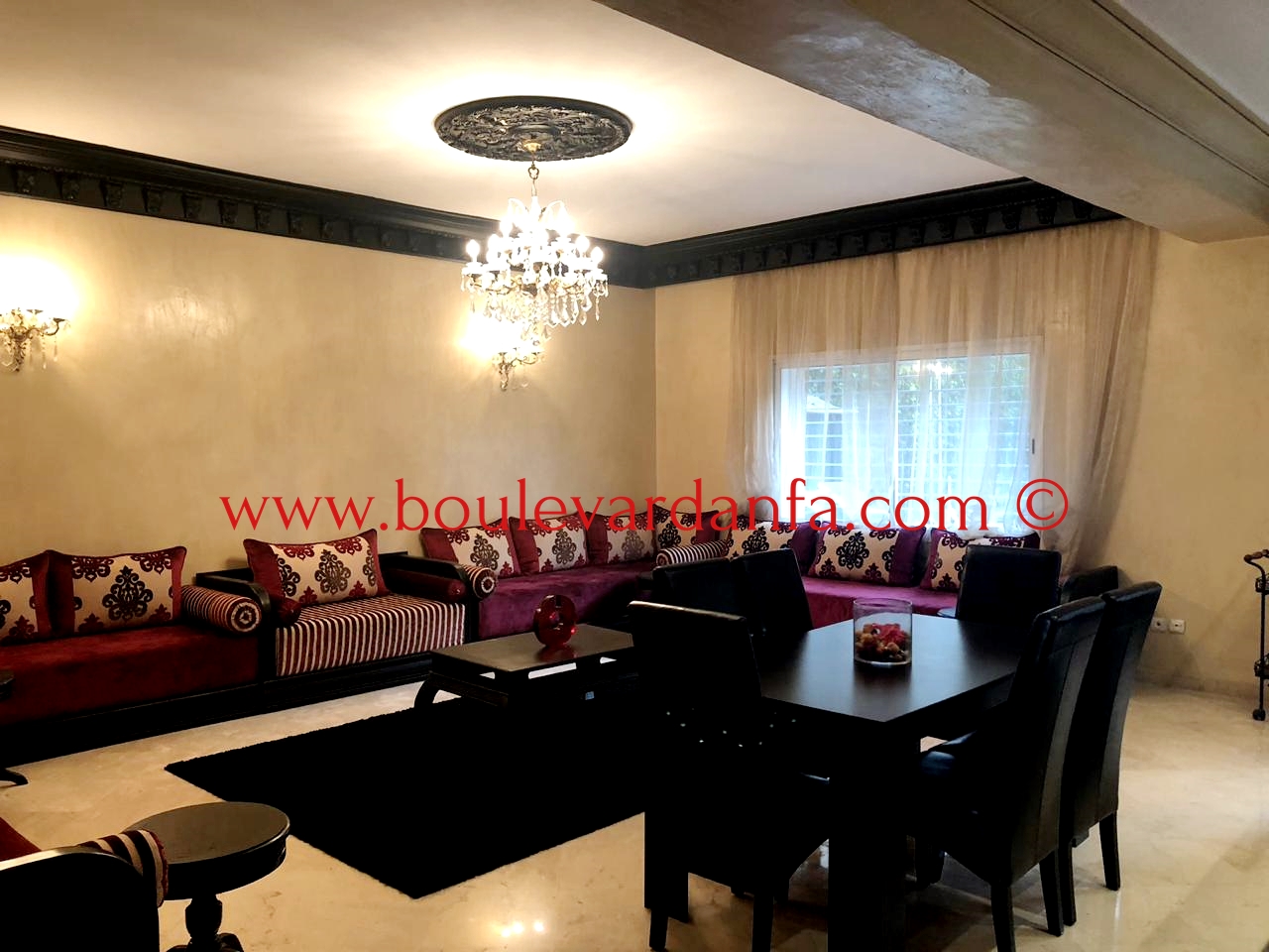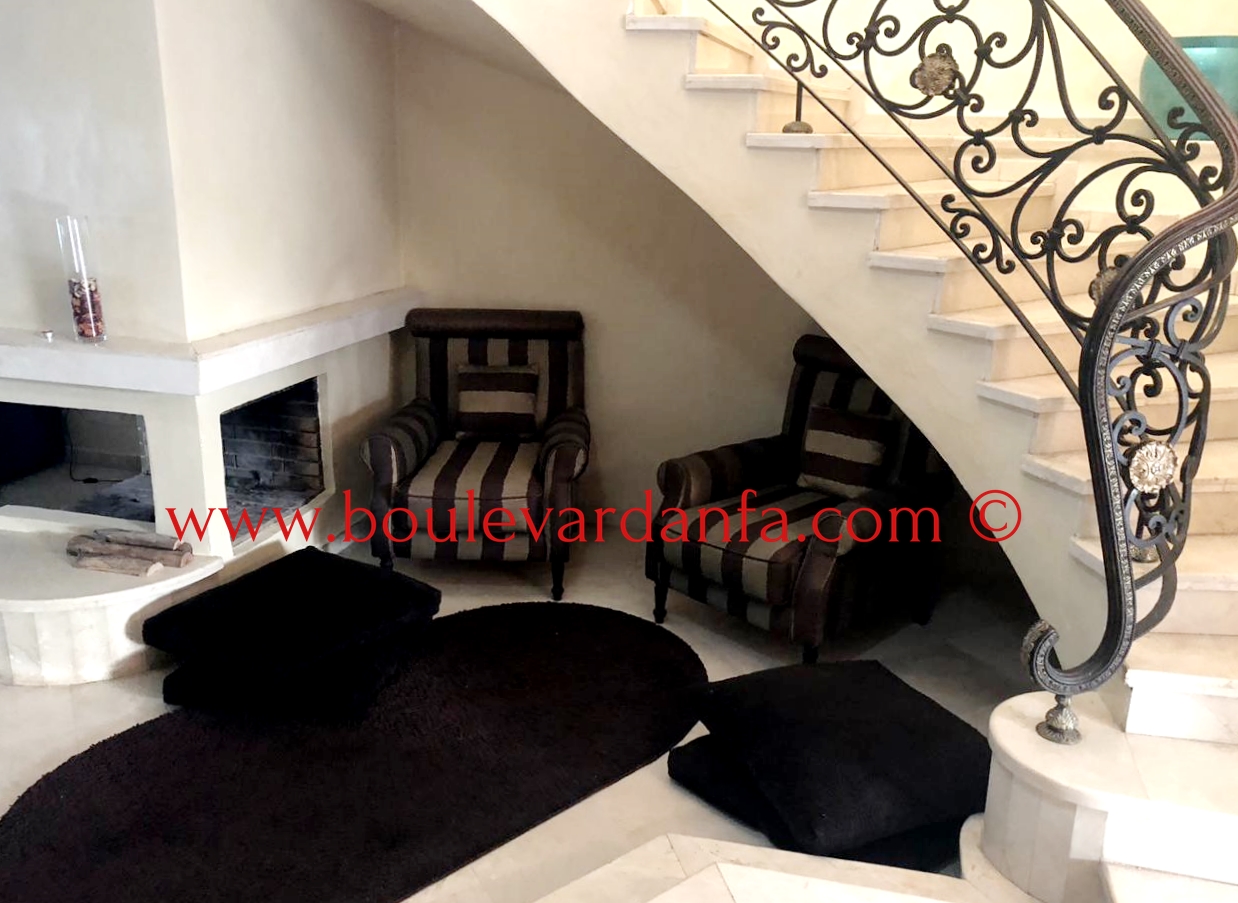 Luxueuse villa de 400 m ² à louer meublée à Résidence les arganiers à la sortie de Casablanca se composant au rez de chaussée d'un séjour, d'un salon marocain, d'un salon européen avec cheminée, d'une grande cuisine et d'une salle de bain invités, à l'étage 3 chambres chacune avec sa salle de bain dont une suite parentale avec grand dressing et balcon. Au jardin, une belle piscine et chambre pour le personnel.
