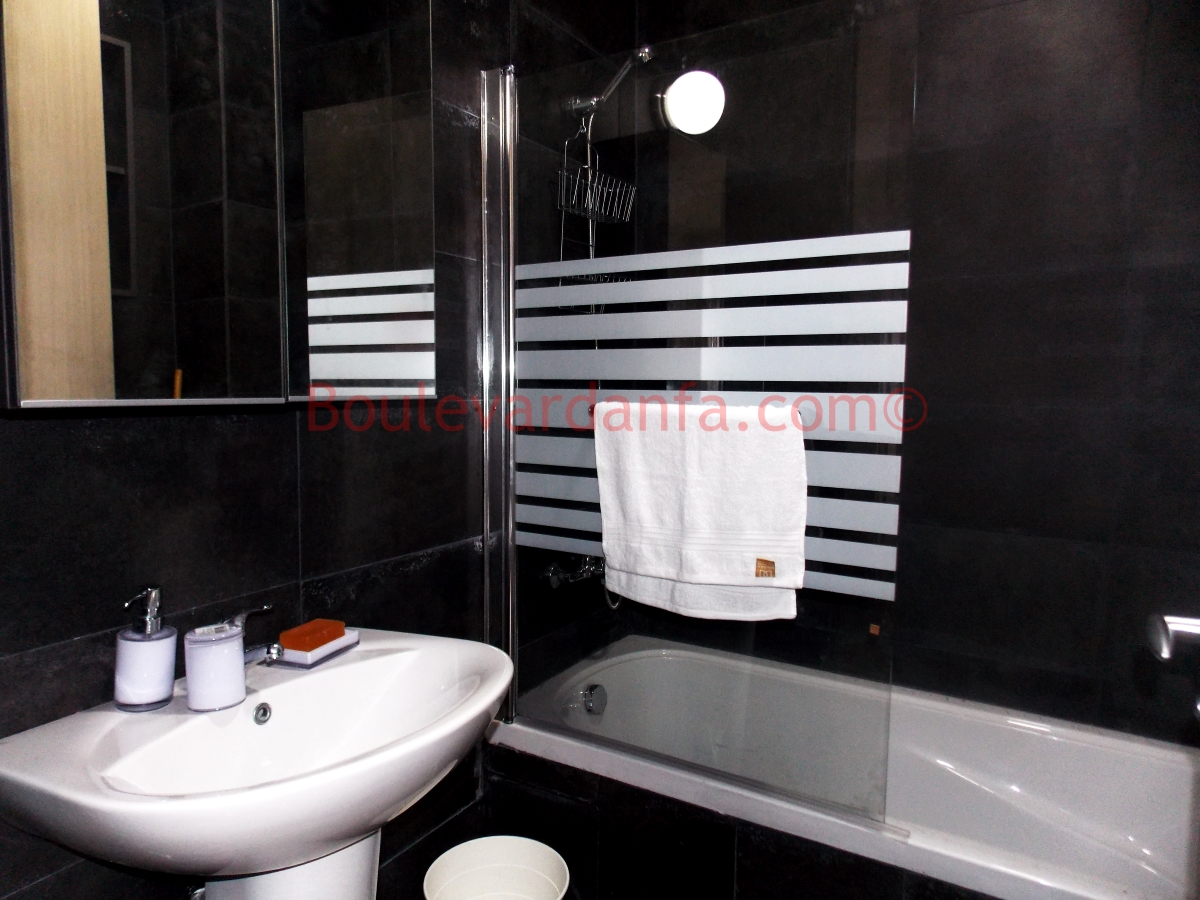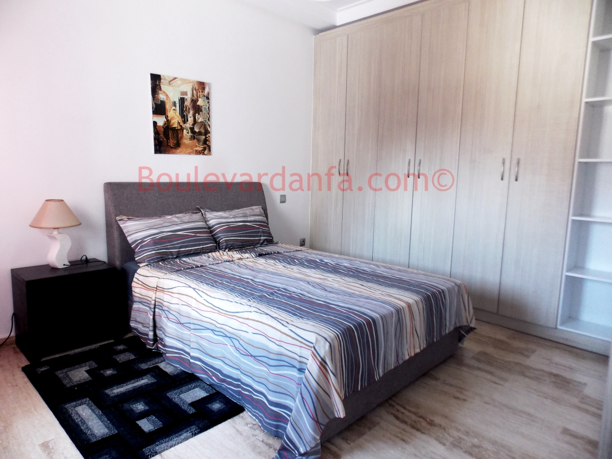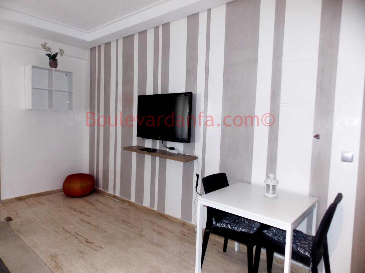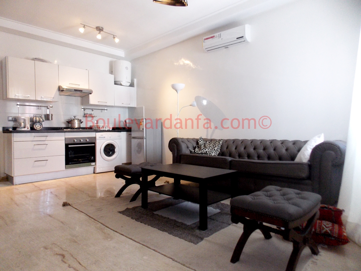 Studio neuf, situé à 250 m du futur quartier d’affaire n° 1 du Maroc « Casablanca Finance City », dans une rue parallèle à Bd Yaacoub El Mansour, dans une résidence neuve. Il se compose d’une chambre à coucher, un salon, une cuisine américaine et une salle de bain avec baignoire.